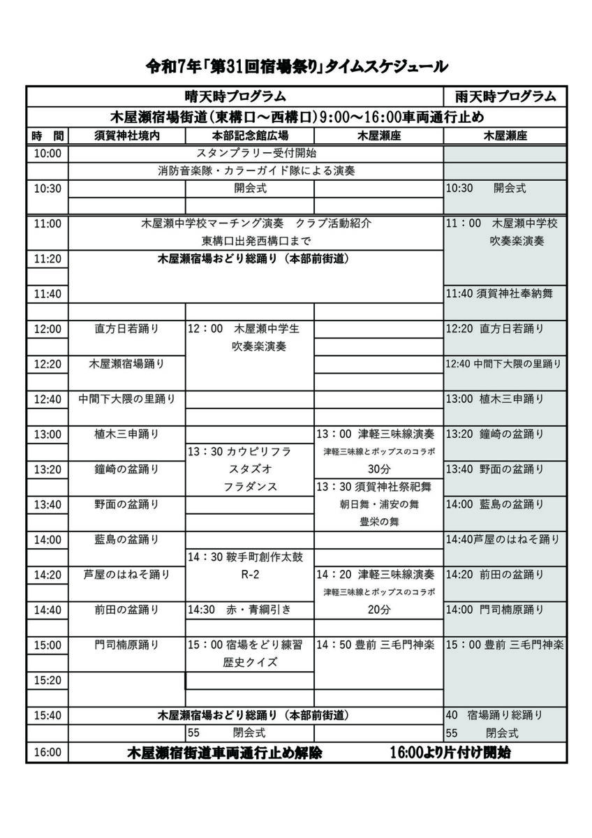 県指定無形民俗文化財”木屋瀬宿場をどり”(盆踊り)をはじめ、旧街道筋の旧家による資料展示や企画展、スタンプラリー(木屋瀬宿探訪)、また宿場内にて行われる木屋瀬中学校吹奏楽部によるマーチングなど、木屋瀬の歴史と文化を中心とした多彩な行事が開催されます。