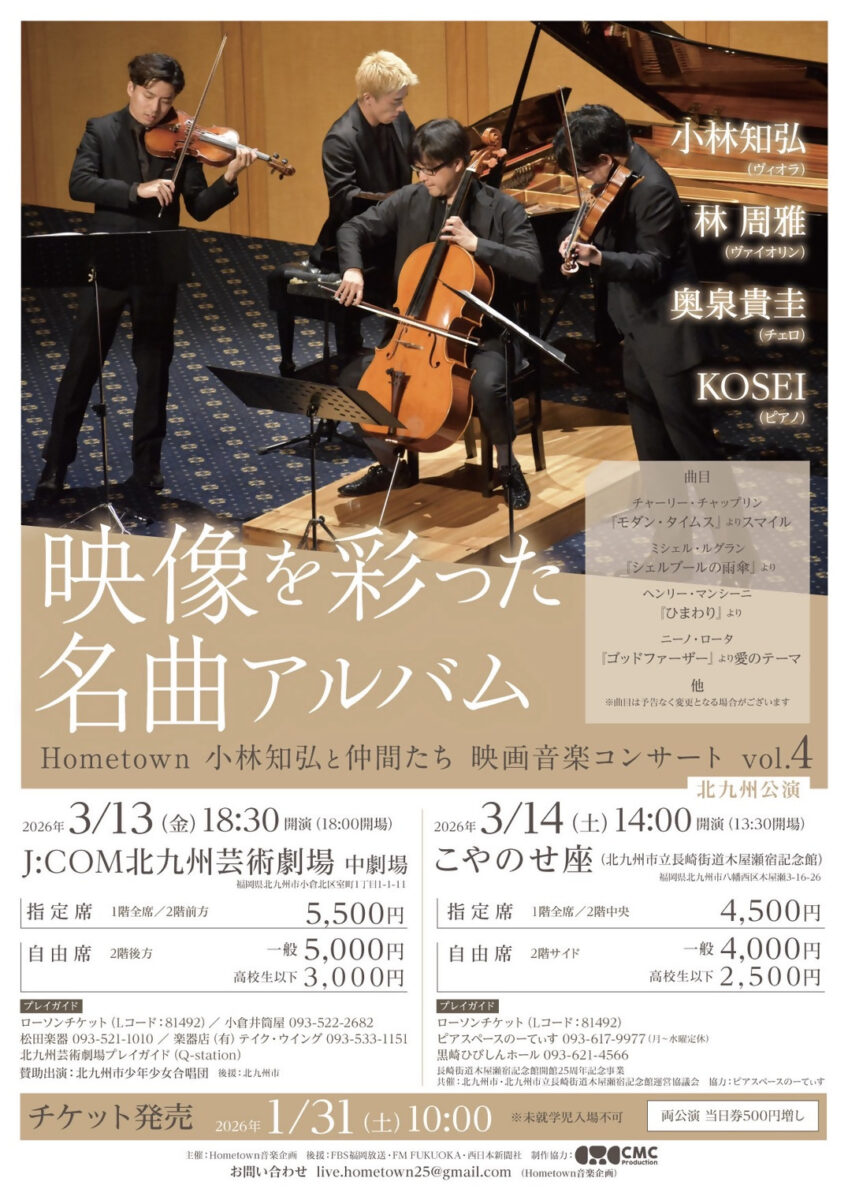『長崎街道を音楽でつなぐ』ことを目的に開催する本公演は、木屋瀬と長崎にルーツを持つヴィオラ奏者・小林知弘を筆頭に結成されたピアノ四重奏グループが行うコンサートです。ヴィオラ・ヴァイオリン・チェロ・ピアノで構成されるピアノ四重奏で奏でられる映画音楽をどうぞゆっくりご堪能ください。