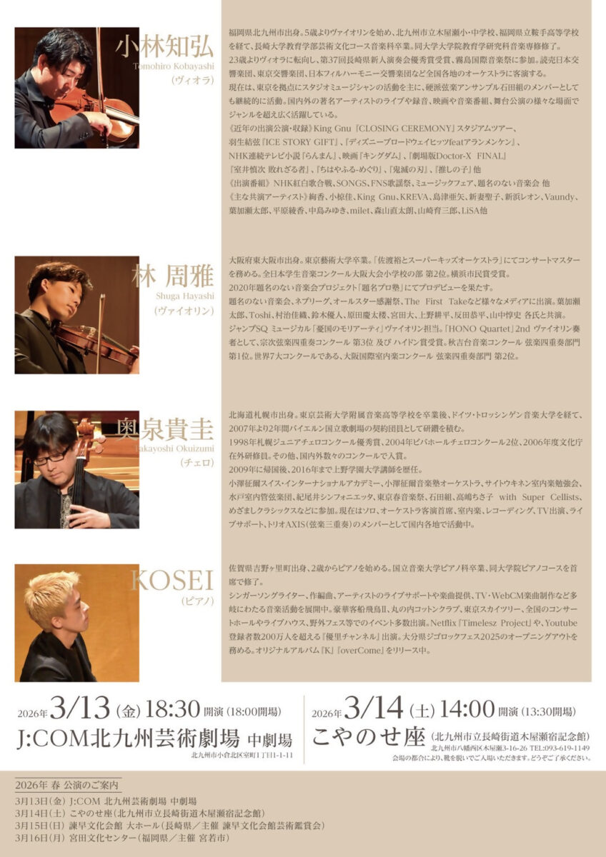 奏 者 小林知弘(ヴィオラ)・林周雅(ヴァイオリン)・奥泉貴圭(チェロ)・KOSEI(ピアノ)